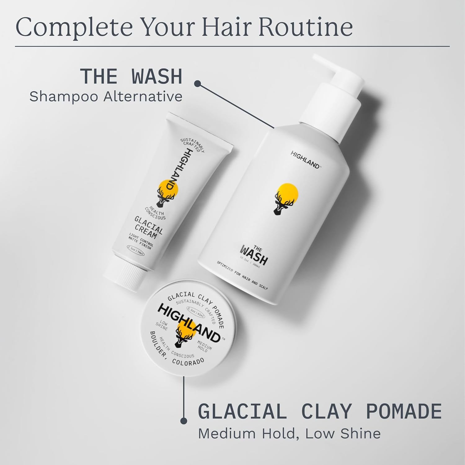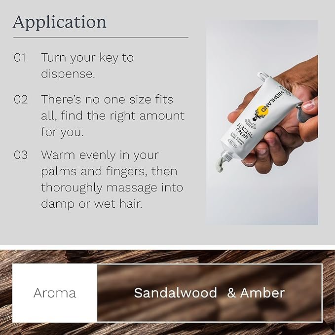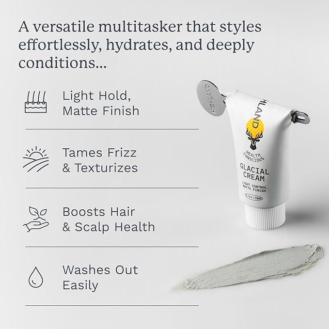 Highland Glacial Cream is a light-control, matte-finish styling cream that deeply conditions, tames frizz, and enhances natural hair texture. Crafted with 15 natural, sustainably sourced ingredients like Canadian Glacial Clay, organic caffeine, and shea butter, it nourishes hair and scalp while providing hydration and smooth styling. Suitable for all hair types, it offers versatile use for curls, slicked-back styles, or frizz taming, delivering healthier, happier hair with a subtle natural scent. Try it for effortless, textured looks with a clean, plant-based formula.