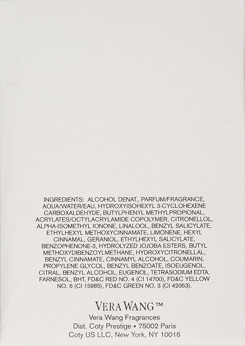 Vera Wang Eau de Parfum Spray is a modern and elegant floral fragrance designed for women who appreciate sophistication and warmth. It features top notes of calla lily, mandarin blossom, and Bulgarian rose, followed by heart notes of gardenia, iris, and lotus flower. The scent is grounded in a soft base of musk, blonde woods, and floral accords, creating a timeless and radiant aroma. Perfect for special occasions or daily wear, this parfum embodies grace and confidence. Discover the essence of Vera Wang today
